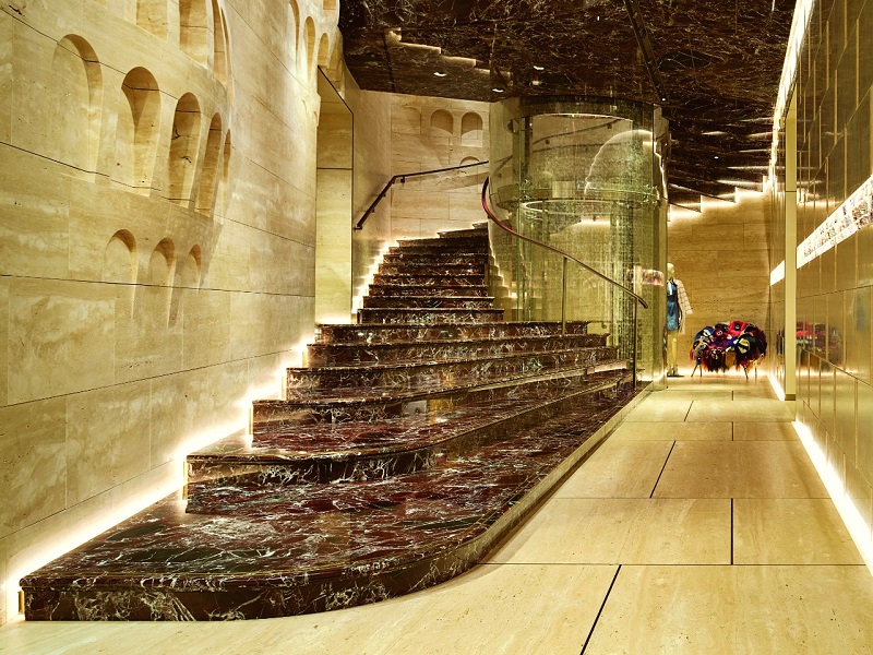 Stepping inside the store, a concentric circle configuration underfoot, created by an intricate intarsia of precious marbles, pays homage to the geometric pattern found in St Peter’s Basilica, while the use of travertine — traditionally associated with classical roman monuments and architecture — represents continuity with the past and the glory of Rome. A staircase cut from striking Lepanto marble beckons customers to the upper floor where more masterpieces await.