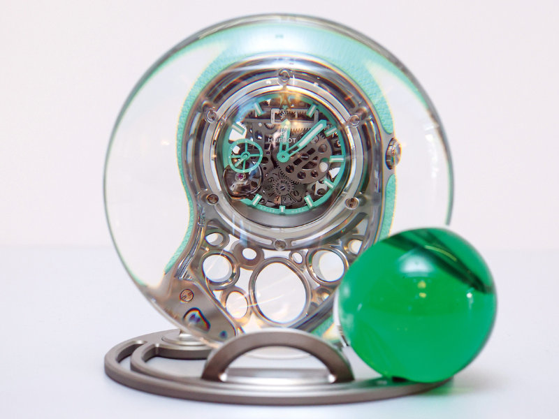 At first glance, the asymmetrical Splash appears to drift from Hublot’s familiar design language, its sinuous silhouette breaking from the brand’s muscular geometry. Look closer, though, and the DNA is unmistakable: the six H-screws securing the bezel and caseback, the lugs anchoring each side and the titanium H-shaped clasp tying it all together. Comprising 264 components, the watch — transparent yet weighty, futuristic yet somehow archaeological — encapsulates Arsham’s preoccupation with objects that exist outside a prescribed era. Even the green accents — a hue he perceives most vividly due to partial colour blindness — seem to pulse faintly, mimicking the oxidised surfaces of bygone relics.