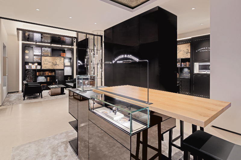 Creative problem-solving is evident in the interlocking volumes of movable walls and sliding doors, which demarcate areas for specific functions: watch display, consultation, presentation, purchase. Esteemed clients seek privacy in the VIP room or discreet lounge, but luxe materials — spanning technical steel to natural stone — and Walter Lange’s personal motto, “Never stand still”, inscribed on a wall are for all to enjoy. Reminding visitors that they are in the presence of supreme haute horlogerie is the Experience Library, a window to the world of A. Lange & Söhne, where strict tradition and sheer ingenuity frolic.