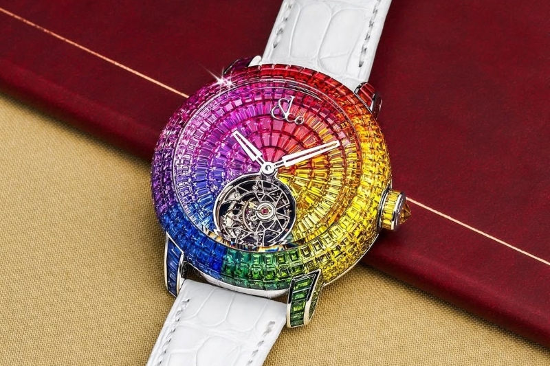 Following the opening events, a glamorous gala hosted at JW Marriott Singapore South Beach kept the celebrations going. On top of a majestic hall framed by scarlet drapery and punctuated by sculptural floral accents, guests were invited to discover a curated collection of Jacob & Co’s most recognisable pieces, each a powerful portrayal of mechanical artistry and gem-setting prowess. Among the key articles shown during the reception were the Bugatti Tourbillon Baguette, which stars a miniature V16 engine block automaton capable of moving on demand, housed within a glittering case paved with 328 baguette-cut diamonds. The enchanting Caviar Tourbillon Rainbow captivated with its 424 seamlessly arranged, multicoloured gems surrounding a flying tourbillon. Reflecting a more organic influence, the Fleurs de Jardin borrows the Astronomia’s engineering to depict an immaculate garden full of life.