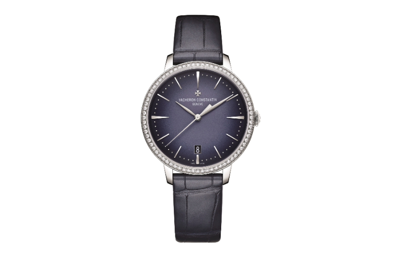 Sweeping across these slightly convex dials are leaf-shaped hands that add a certain elegance to the overall composition. Inside the 36.5mm dial is the Calibre 2450 Q6/3, which has a 40-hour power reserve. The movement also powers the date display at six o’clock. Like the Traditionnelle, the Patrimony has Mississippiensis alligator leather straps with a satin effect in night blue or rosy beige that are integrated with the self- interchangeable system.
