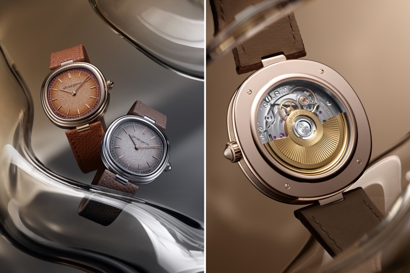 Two new time-only masterpieces join the Gérald Genta Geneva collection, a series named after the legendary designer’s birthplace and the heart of the maison’s contemporary revival. Now refined to a slender 38mm profile, the signature cushion-shaped case achieves an equilibrium that is soft yet defined, ensuring a silhouette that is as timeless as it is wearable. The collection explores two distinct chromatic personalities: a warm-toned variant featuring a brass dial with a deep, smoked gradient effect, and a cool interpretation in silver-shaded brass framed by a white gold case. Through the sapphire caseback, the Zenith Elite GG-005P automatic movement is visible, beating at a precise 4 Hz with a 50-hour power reserve.