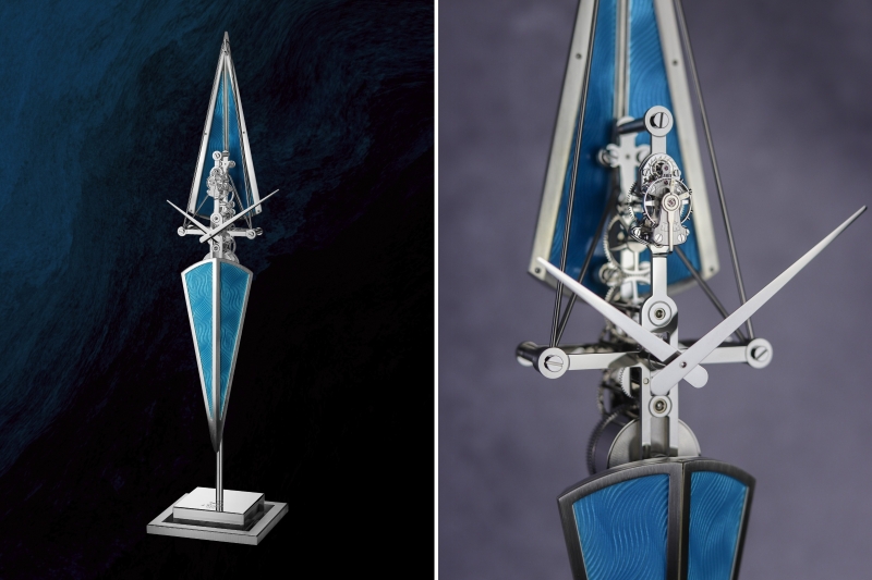 Evoking the slender, aerodynamic silhouette of a racing skiff, L’Epée 1839 presents La Regatta, a vertical timepiece that translates the kinetic energy of rowing into the language of métiers d’art. The hull is adorned with exquisite Grand Feu enameling by the renowned David Kakabadze Enamel atelier. This meticulous undertaking of successive firings echoes the fluid, repetitive stroke of an oar, creating a luminous surface that ripples like water. The effect is most apparent in the Blue Horizon variation, further enriched by the depth of flinqué enameling, which also combines guilloché engraving in the process.