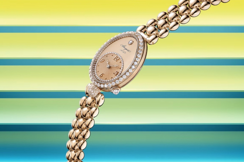 The Reine de Naples collection pays homage to a landmark moment in horology: the invention of the very first wristwatch. Originally commissioned by Caroline Murat, Queen of Naples, the contemporary line reinterprets that historic 1812 design for the modern woman. Crafted in 18-carat Breguet gold, the Ref 8925 is an elegant ovoid timepiece that sports a hand-guilloché Quai de l’Horloge pattern on the off-centred dial, ringed with diamonds, of course. Additional stones encircle the bezel, while a lone briolette-cut diamond is set on the crown at 4 o’clock. Crafted with a sequence of polished oval and circular links, the supple bracelet is a statement piece of jewellery in its own right.