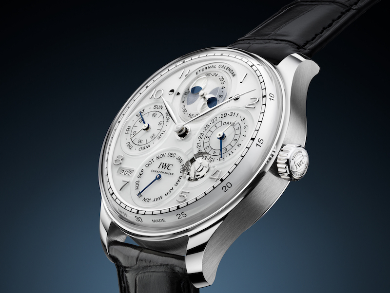 From left: Rolex Perpetual 1908, IWC Schaffhausen Portugieser Eternal Calendar, and Patek Philippe World Time Date Ref. 5330G-001.