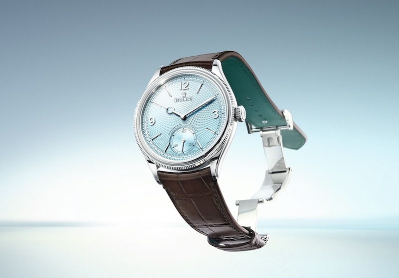Last year, Rolex introduced a new dress watch to the Perpetual collection to replace the discontinued Cellini. The elegant 39mm Perpetual 1908 debuted in 18-carat yellow and white gold, but this year, a 960 platinum model enters the mix, featuring a guilloché rice-grain motif on an ice blue dial and a filet sauté guilloché pattern outlining the minute track. It’s powered by Calibre 7140, a movement developed purposefully for this model that incorporates the patented Chronergy escapement, Syloxi hairspring and Paraflex shock absorbers. Like all Rolex watches, the Perpetual 1908 carries the Superlative Chronometer certification, which ensures excellent performance on the wrist.